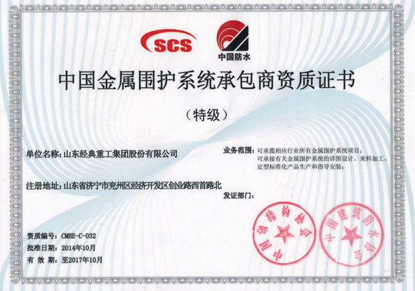 經(jīng)典集團(tuán)喜獲中國金屬圍護(hù)系統(tǒng)承包特級資質(zhì)