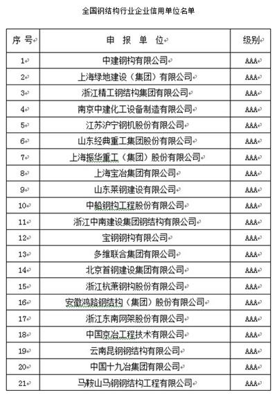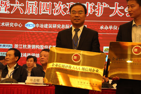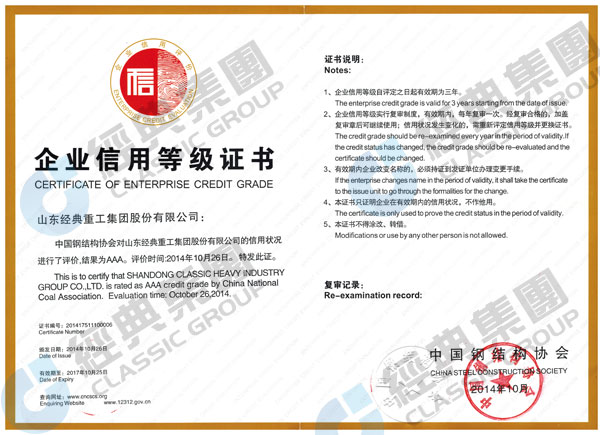 2014年10月26-27日,在南京國際會議中心隆重舉辦的中國鋼結構協(xié)會成立三十周年紀念大會暨六屆四次理事會擴大會議上,山東經典重工集團股份有限公司獲得首批全國鋼結構行業(yè)AAA級信用企業(yè)。