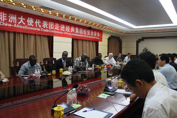 7月15日--17日由中國(guó)信息協(xié)會(huì)民營(yíng)企業(yè)分會(huì)組織,盧旺達(dá)駐華使館查爾斯大使作為非洲經(jīng)貿(mào)考察團(tuán)團(tuán)長(zhǎng)率領(lǐng)烏干達(dá)駐華大使、南蘇丹駐華公使、阿爾巴尼亞駐華大使以及盧旺達(dá)駐華商務(wù)參贊到經(jīng)典集團(tuán)洽談業(yè)務(wù)合作。中國(guó)信息協(xié)會(huì)民營(yíng)企業(yè)分會(huì)會(huì)長(zhǎng)張鋁,國(guó)際部部長(zhǎng)關(guān)偉娜,中國(guó)駐湯加王國(guó)前大使孫增森,經(jīng)典集團(tuán)董事長(zhǎng)苗樹(shù)文,總經(jīng)理杜福生及有關(guān)人員等陪同了此次活動(dòng)。