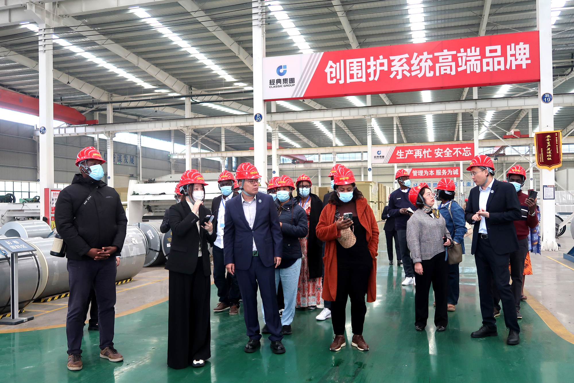 10月22日上午,商務(wù)部援外培訓(xùn)項(xiàng)目“科特迪瓦中高級(jí)外交官研修班”一行20余人,在山東外貿(mào)職業(yè)學(xué)院國際官員研修學(xué)院院長王保紅帶隊(duì)下,蒞臨經(jīng)典集團(tuán)就工業(yè)發(fā)展經(jīng)驗(yàn)、中外經(jīng)貿(mào)合作等方面的經(jīng)驗(yàn)做法進(jìn)行參觀交流。經(jīng)典集團(tuán)副總經(jīng)理兼生產(chǎn)總監(jiān)張琦、副總經(jīng)理侯士輝等陪同。