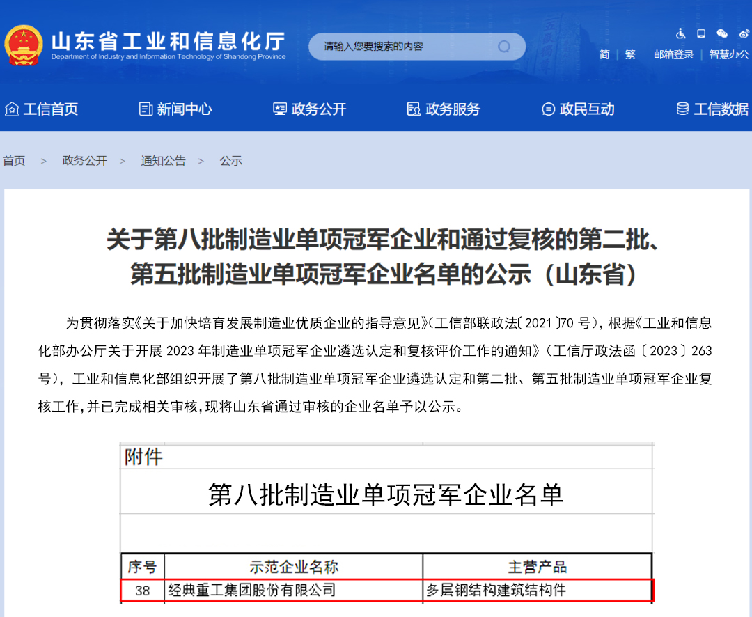 近日,工業(yè)和信息化部第八批制造業(yè)單項冠軍示范企業(yè)名單公示,經典重工集團股份有限公司位列其中,是該榮譽歷批次認定中唯一一家建筑鋼結構行業(yè)民營企業(yè)。