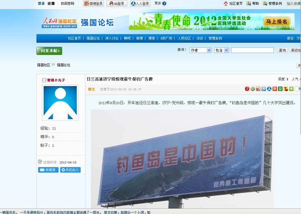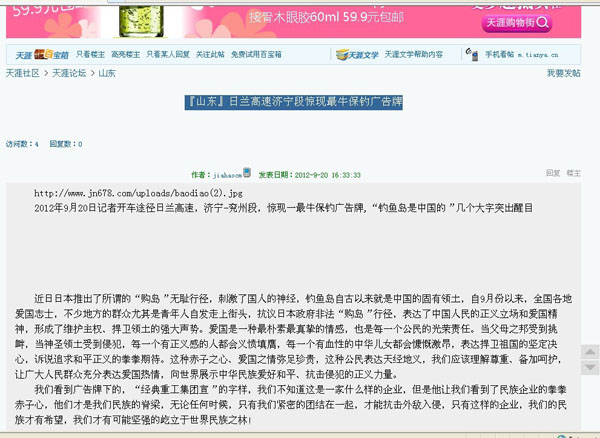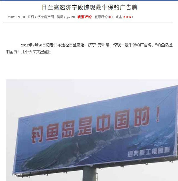 近一段時(shí)期以來日本推出了所謂的“購(gòu)島”無恥行徑,刺激了國(guó)人的神經(jīng),我們集團(tuán)作為中華民族大家庭的一員,有責(zé)任也有義務(wù)保衛(wèi)我們祖國(guó)領(lǐng)土的完整,和不容侵犯,為此集團(tuán)領(lǐng)導(dǎo)代表集團(tuán)全體員工通過各種方式彰示了我們的愛國(guó)熱情,并付諸于實(shí)際行動(dòng)斥巨資在日蘭高速濟(jì)寧段制作了高炮廣告“釣魚島是中國(guó)的”以顯示我們保釣之決心。